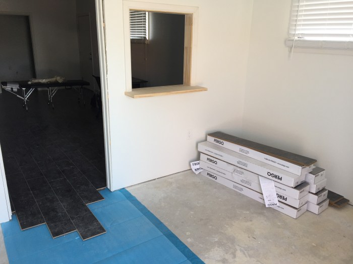 I spy the rest of the flooring, a chiropractic table in the background, and a spine model. Oh, my.